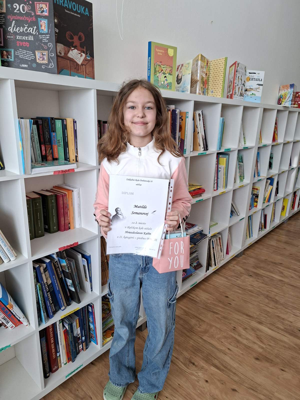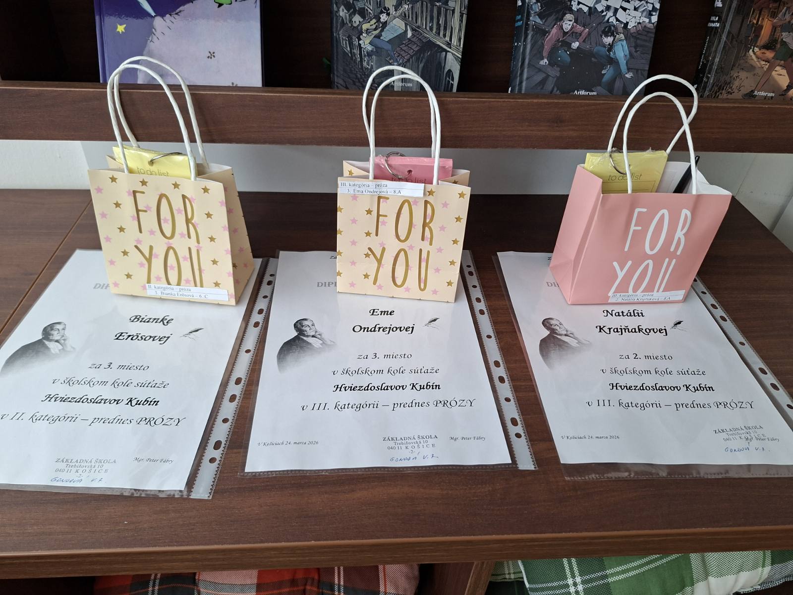 Naši žiaci opäť dokázali že láska k literatúre má na našej škole pevné miesto. V okresnom kole recitačnej súťaže Hviezdoslavov Kubín naši recitátori preukázali výbornú interpretáciu textu. V umeleckom prednese sa predstavili títo žiaci: Simona Buksarová (3. C), Dávid Siewerski (4. C) Igor Bodnár (5. A), Sofia Buksarová (6. A), Simona Krajčiová (7. B), Matej Gavaľa (9. C).